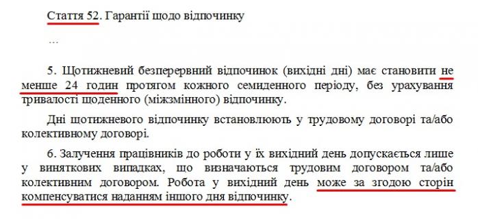 Ч. 5 ст. 52 законопроєкту не містить чіткого, фіксованого формулювання про впровадження 6-денного робочого тижня. Компенсувати ж роботу у вихідний день пропонується наданням іншого дня для відпочинку. Нинішніми нормами КЗпП пропонується, що робота у вихідний може компенсуватись за згодою сторін наданням іншого дня відпочинку або у грошовій формі у подвійному розмірі.