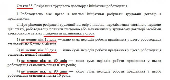 Як бачимо, у ст. 35 законопроєкту про працю вказано строки звільнення та передбачено варіанти, як повідомити найманому працівнику про його звільнення.