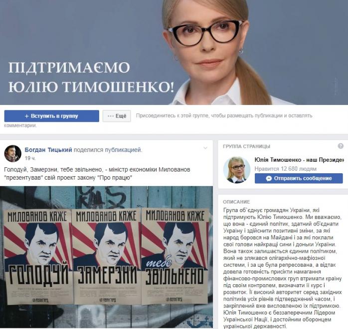 До речі, публікацію про акцію із плакатами Милованова поширили у групі на підтримку Юлії Тимошенко, яка звісно зацікавлена в тому, аби Верхова Рада прийняла саме її проєкт Кодексу України про працю.