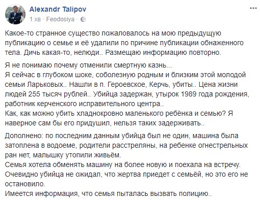 "Я зараз у глибокому шоці, співчуваю рідним і близьким цієї молодої сім'ї Ларькових.. Знайшли в п. Героївське, Керч, вбиті.. Ціна життя людей 255 тисяч рублів.. Вбивця затриманий, утирок 1989 року народження, працівник керченського виправного центру..", - повідомляє Таліпов.