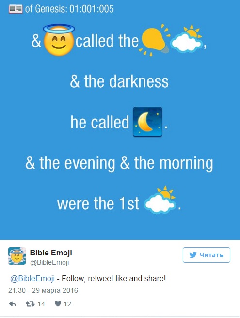 "Я хотів зробити текст Біблії схожим на те, чим люди діляться в SMS, або на твіти, скоротивши загальну кількість символів", - розповів автор видання. За його словами, ідея передати у вигляді піктограм текст Біблії народилася з твіттера @BibleEmoji.