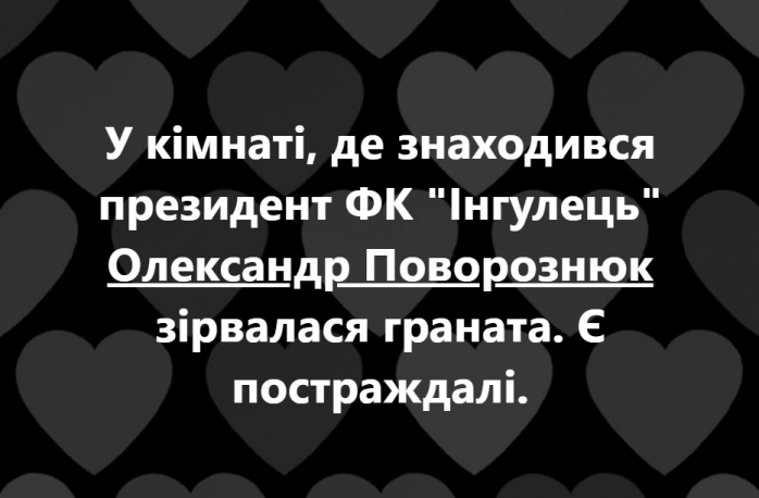 Під час робочої зустрічі у кімнаті, в якій перебував президент ФК "Інгульця" Олександр Поворознюк, вибухнула граната. Про це повідомляє спільнота "ЗМІ нашої громади" у Facebook.