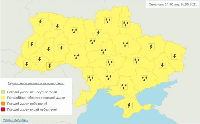 За даними Укргідрометцентру, 27 червня по всій території України варто очікувати дощі та грози. Вдень в окремих районах град та шквали 19-24 м/с; у північних, центральних та південних областях місцями сильні зливи (І рівень небезпечності, жовтий).