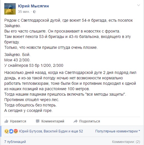 "Кілька днів тому, коли на Світлодарській дузі два дні поспіль лив дощ, і через таку погоду вночі не було можливості нормально працювати тепловізорами, теж були бої і противник підходив до однієї з наших позицій на відстань 100 метрів. Тоді нашим хлопчакам довелося включати усі методи захисту", - повідомив волонтер.