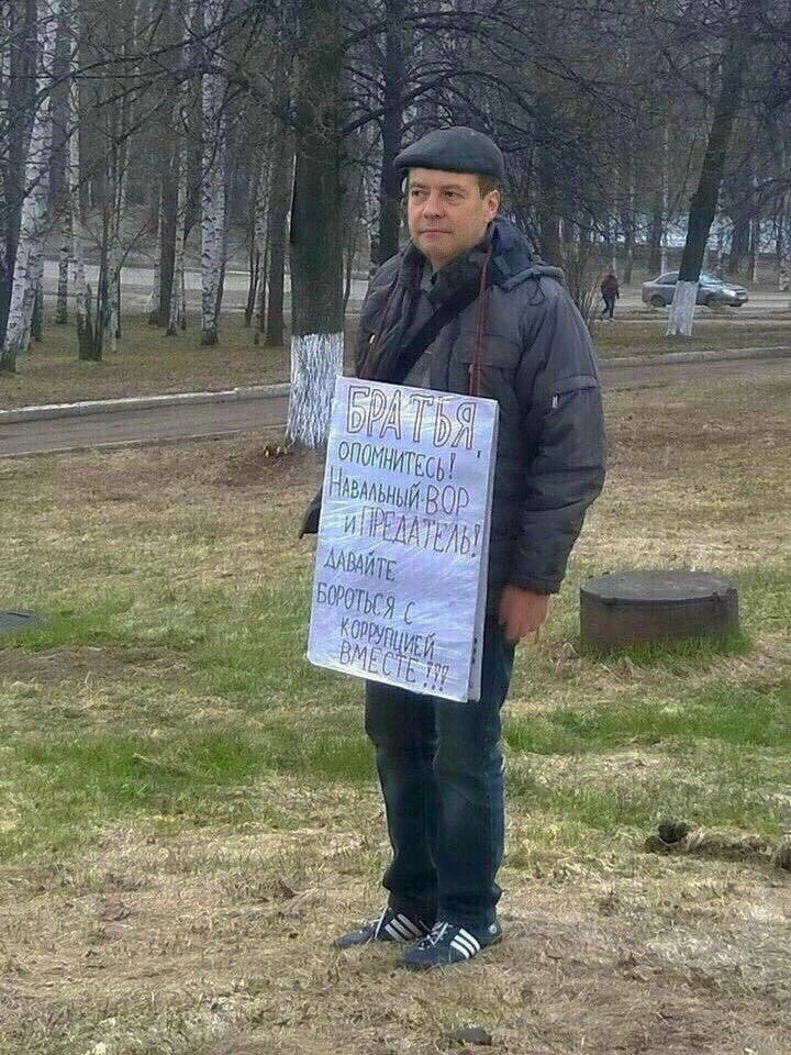 На фото зображений чоловік з обличчям російського прем'єра, на шиї у якого висить плакат з закликами боротися з корупцією. "Брати, схаменіться! Навальний злодій і зрадник! Давайте боротися з корупцією разом!", - свідчить напис.