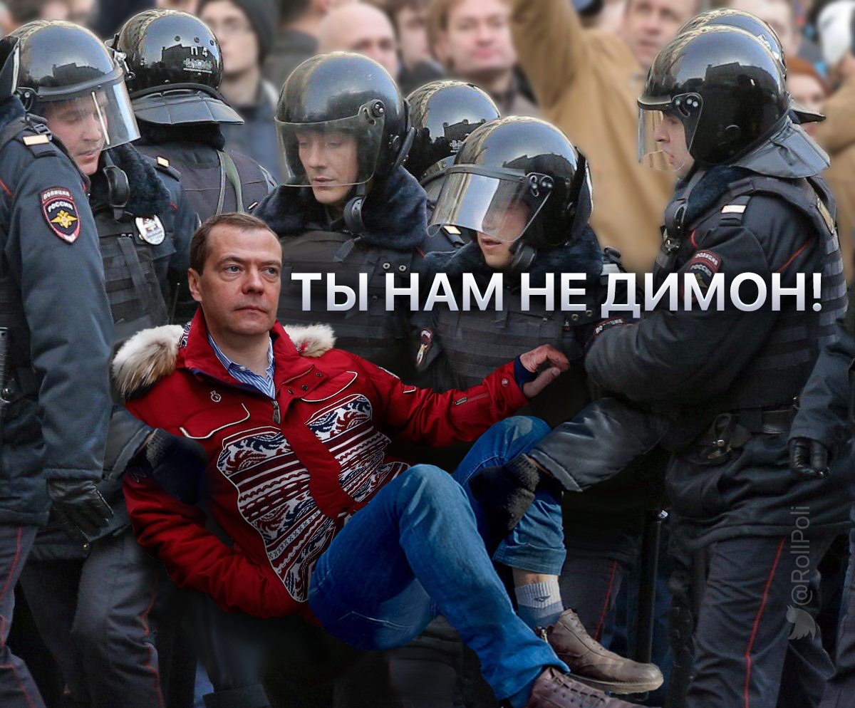 Зображення також надихнуло блогерів на створення ще одного колажу на тему акцій протесту. За основу взяли фотографію затримання на антикорупційному мітингу в Москві дівчини і помістили туди зображення Медведєва.