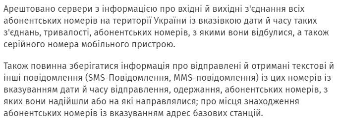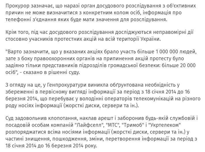 Суд Києва заарештував сервери з інформацією про телефонні з'єднання всіх абонентських номерів всіх мобільних операторів України з січня до березня 2014 року.