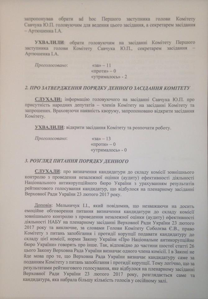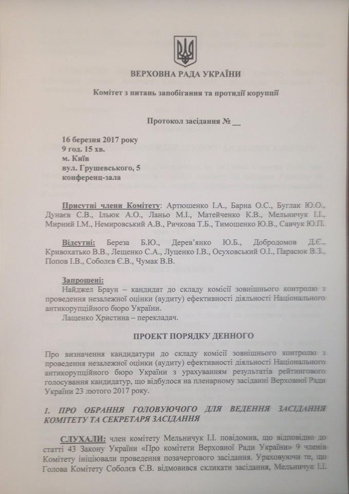 Частина депутатів з комітету Верховної Ради України з питань запобігання і протидії корупції сьогодні ранком провели засідання і склали протокол цього заходу. Копію документу опублікував Віталій Шабунін, голова правління «Центру протидії корупції»