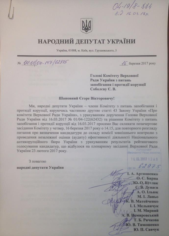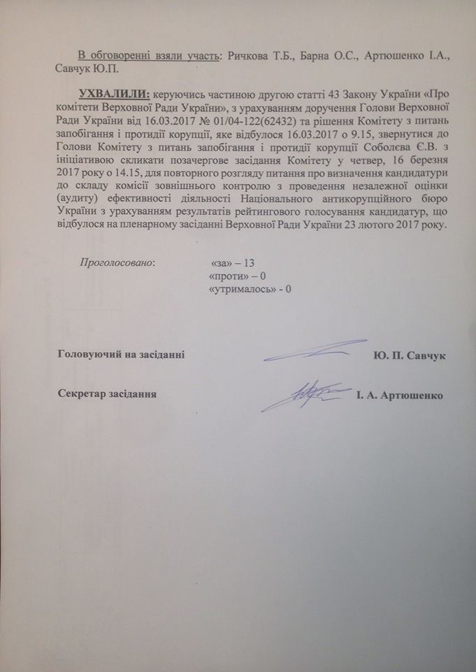 На засідання ухвалили звернутись до керівника комітету Єгора Соболєва («Самопоміч») аби він скликав на 14.15 засідання комітету для повторного розгляду питання про визначення кандидата від парламенту до складу комісії по оцінці діяльності Національного антикорупційного бюро України за результатами рейтингового голосування від 23 лютого. Тоді більшість депутатів проголосувала за детектива Найджела Браун, який не зміг пояснити хто взагалі його запросив в Україну на цей захід. Також Браун вже дав інтерв’ю, у якому негативно оцінив діяльність НАБУ.