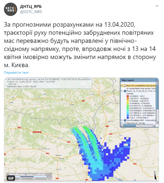 Однак за розрахунками Державного науково-технічний центру з ядерної та радіаційної безпеки, рух потенційно забрудненого повітря може змінити траєкторію у сторону Києва.