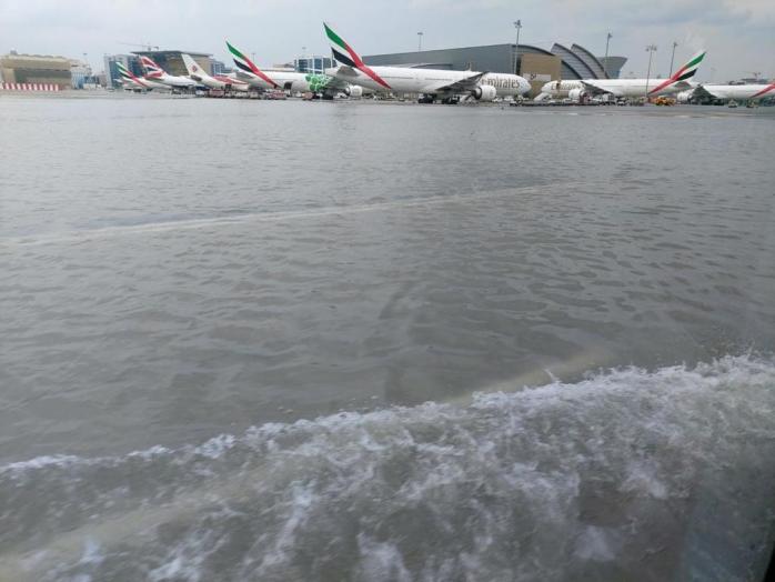 На відео з аеропорту Дубая зафіксовані залиті водою перони і злітно-посадкові смуги. Десятки рейсів затримуються і на виліт, і на прибуття. А на деяких вулицях затопило припарковані авто і люди пересуваються на човнах.