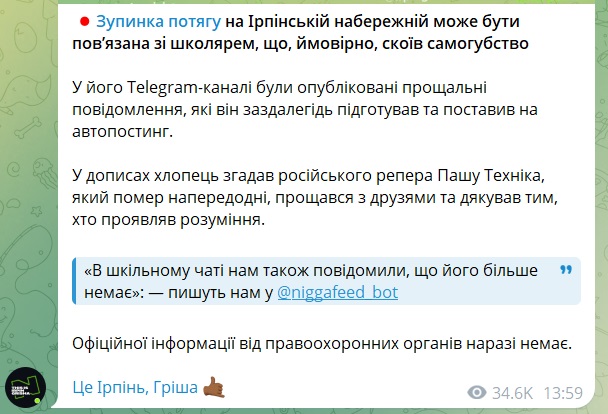 Пообіді стало відомо, що зупинка поїзда пов’язана зі школярем, що скоїв самогубство. У його Telegram-каналі були опубліковані прощальні повідомлення, які він заздалегідь підготував та поставив на автопостинг.