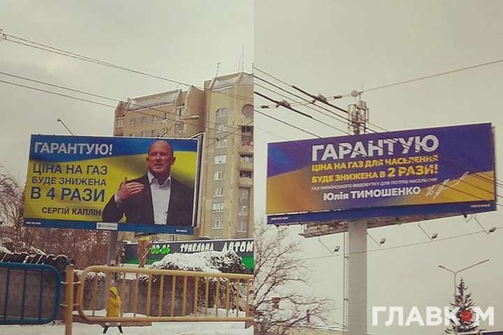 Зазначимо, лідер партії «Батьківщина» Юлія Тимошенко обіцяє знизити для населення ціну на газ українського видобутку у два рази. Відповідне гасло розміщене на біллбордах.