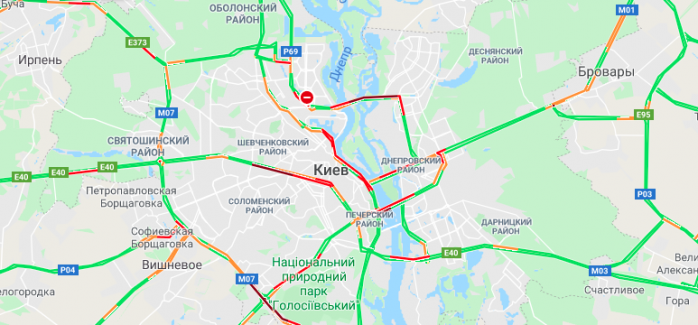 В Київі 1 червня станом на 9:30 на декількох мостах утворилися затори. Про це свідчать дані онлайн-сервісу Google Maps.