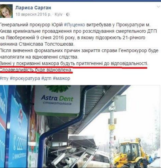 "Тоді я зробив припущення, що "мажор" відповідальності не понесе. Ну а влітку прокуратура Києва закрила цю справу "за відсутністю складу злочину". Через обурення соцмереж таким рішенням прокуратури Генпрокурор Луценко дав вказівку справу поновити. А його речниця Лариса Сарган навіть у себе в ФБ написала: "Винні у покриванні мажора будуть притягнені до відповідальності". Це було 10-го вересня.