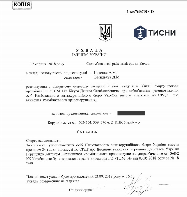 Солом’янський райсуд Києва зобов’язав Національне антикорупційне бюро розпочати розслідування стосовно джерел збагачення народного депутата Антона Геращенка. Це рішення суд виніс після звернення юристів “Тисни” (Bihus.Info) за матеріалами журналістів програми “Наші гроші з Денисом Бігусом”.