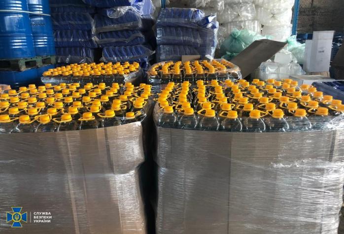 Під час слідчих дій за місцем виробництва було виявлено обладнання для виготовлення та розливу фальсифікованого антисептичного розчину, понад 13 тонн спиртової суміші, зокрема етиловий спирт, антифриз, гліцерин. А ще було знайдено наклейки, пластикові ємності, дві печатки, антисептичний розчин та приблизно 30 тонн паливно-мастильних матеріалів невідомого походження.