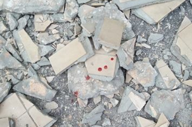 У Києві на Жилянській, 107 біля заводу "Ленінська кузня" на верхній частині стіни будинку обвалилася стара плитка. Шматки впали на припарковані машини і на перехожого.