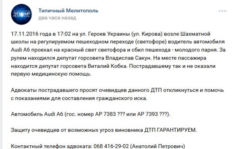 Водій "Audi A6" збив молодого хлопця на пішохідному переході, проїхавши на червоний сигнал світлофора, у Мелітополі 17 листопада. Про це повідомляють користувачі пабліку "Типовий Мелітополь"