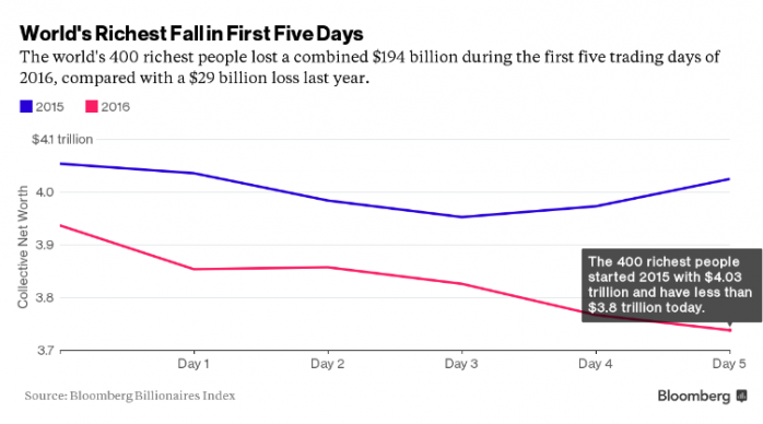 П'ятеро з них заробили 2,5 мільярда доларів, а син засновника компанії Джим Уолтон додав 759 мільйонів доларів. Сукупний статок учасників списку мільярдерів Bloomberg оцінює в 3,7 трильйона доларів. В кінці грудня Bloomberg опублікувало дослідження, згідно з яким до 2015 року відомі бізнесмени стали біднішими. Статки 400 найбагатших людей світу скоротилися в цілому на 19 мільярдів доларів. Агентство також пов'язує це з падінням цін на сировину і ослабленням економічного підйому в Китаї