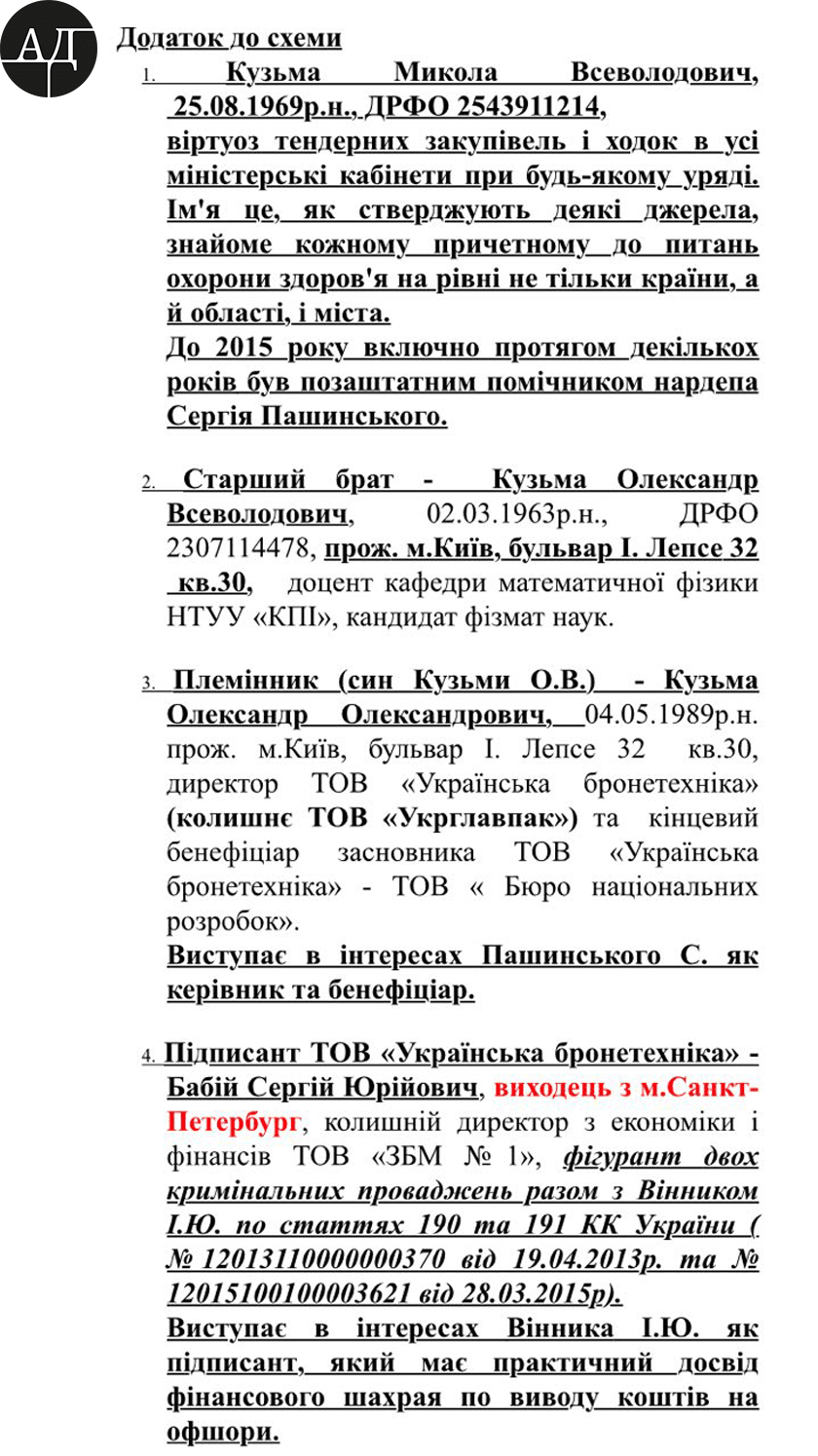 З боку Пашинського таким є Микола Кузьма, племінник якого керує фірмою ТОВ "Українська бронетехніка".