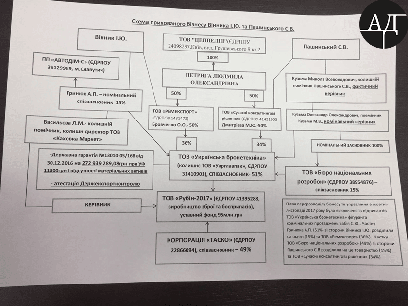 При цьому він публікує схему володіння цими та іншими компаніями "приватної оборонки", в якій явно простежуються інтереси Пашинського і Винника через підставних контролерів і бенефіціарів.