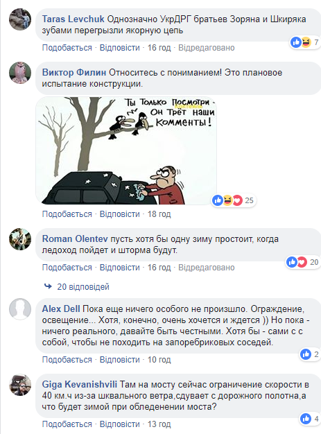 Українські користувачі підхопили цей вислів. "Камені з неба ще будуть!", "Хай хоча би зиму простоїть!", "Ось і перевірили міст на міцність!" - пишуть вони у коментарях.