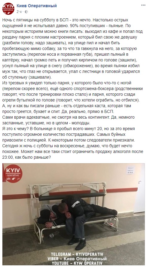 Житель Києва, який став очевидцем того, що відбувається в лікарні швидкої допомоги (БСП) в ніч з п'ятниці на суботу, розповів в мережі про свої враження і повідомив, що більшість пацієнтів надходять до медиків п'яні.