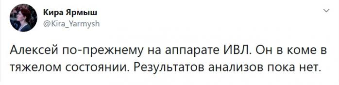 "Олексій, як і раніше, на апараті ШВЛ. Він в комі у важкому стані. Результатів аналізів поки немає", – написала вона.