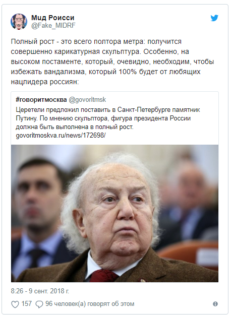 "Повний зріст - це всього півтора метри: вийде абсолютно карикатурна скульптура", - йдеться в повідомленні на сторінці "МЗС Росії" у Twitter.