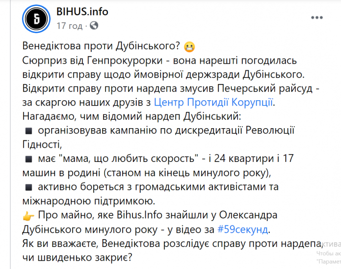 "Як ви вважаєте, Венедіктова розслідує справу проти нардепа, чи швиденько закриє?",- запитують у підсумку розслідувачі.