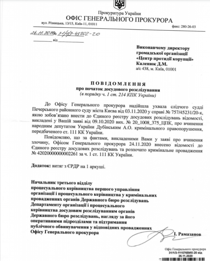 «Центр протидії корупції отримав офіційне повідомлення від Офісу генерального прокурора, в якому чітко вказано, що там справу відкрили за рішенням суду», — заявили у ЦПК.