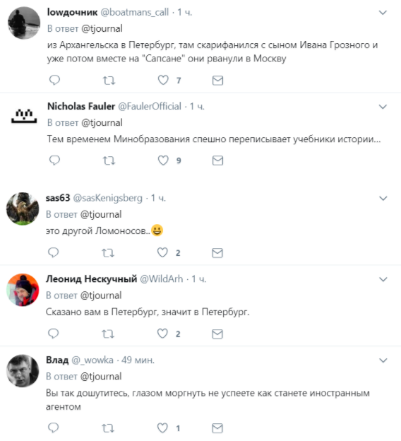 "Тим часом Міносвіти спішно переписує підручники історії", "Це інший Ломоносов", "Сказано вам в Петербург, значить, в Петербург", "Подаруйте йому підручник", - пишуть в інтернеті.