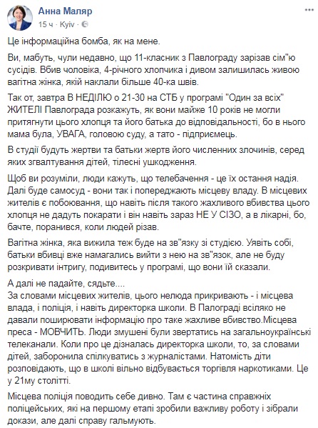 За її словами, ось вже 10 років жителі Павлограда не можуть притягнути до відповідальності підлітка, тому що його мати - глава суду, а батько - підприємець.