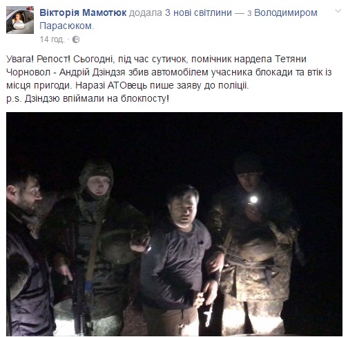 Вона зазначила, що постраждалий ветеран АТО написав заяву до поліції. Згодом Андрія Дзіндзя було затримано на блокпосту.