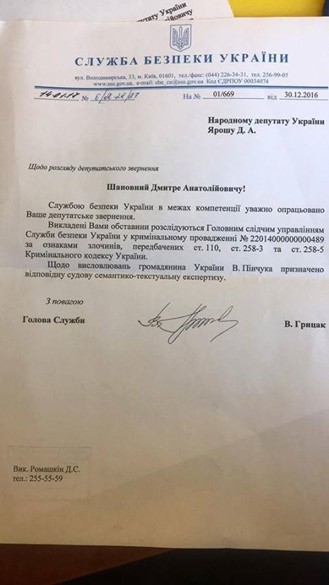 Об этом на своей странице в Facebook сообщил народный депутат Дмитрий Ярош, опубликовав ответ главы СБУ Василия Грицака на официальное обращение.