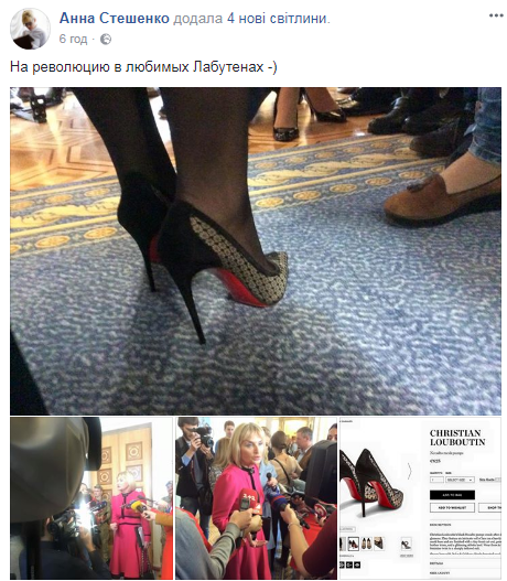 "Дружина генпрокурора Юрія Луценка, депутатка від БПП Ірина Луценко прийшла у Верховну Раду у взутті від відомого бренду Louboutin.