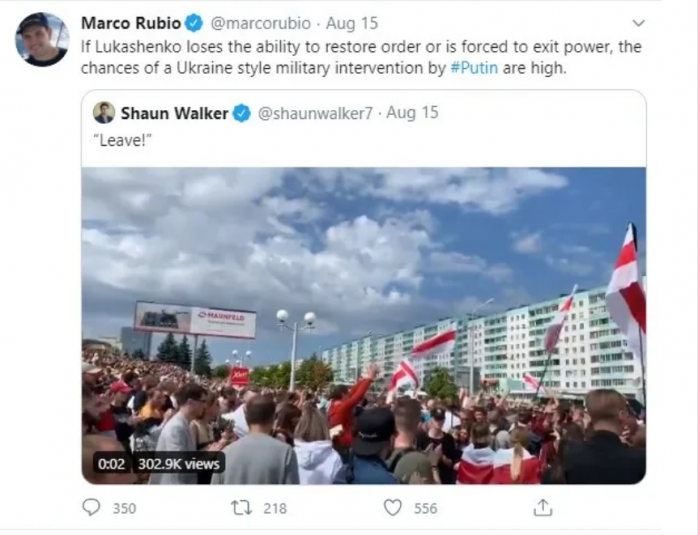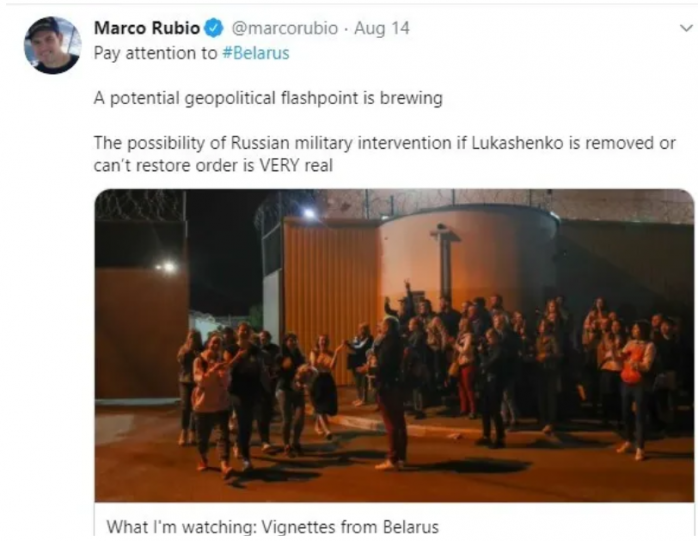 "Якщо Лукашенко втратить можливість відновити порядок, або якщо буде змушений відійти від влади, шанси на український сценарій військового вторгнення Путіним є високими", – наголосив Рубіо.