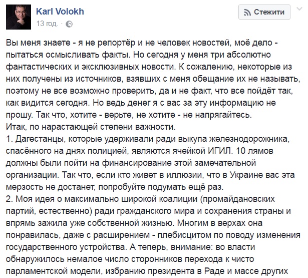 У мене немає ні найменшої можливості верифікувати цю інфу. Вона може виявитися фуфлом. Хоча, відверто кажучи, я не дуже розумію, навіщо їм мене розігрувати – дуже вже незначна я фігура. А от якесь правдоподібне пояснення, чому цю інформацію вкидають росіянам з-за кордону, коли відстежити джерело практично неможливо, я собі спорудив”, – написав Волох.