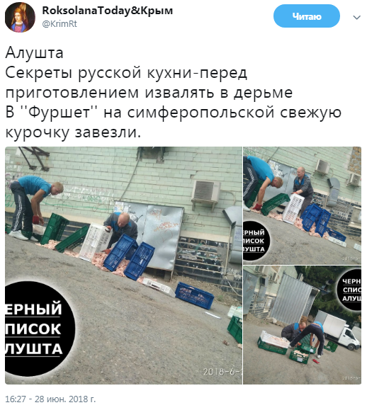 "Секрети російської кухні - перед приготуванням виваляти в лайні. В ''Фуршет'' на Сімферопольській свіжу курочку завезли", - пише автор поста.