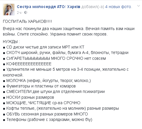 Також у повідомленні перераховуються потреби бійців АТО, що знаходяться в госпіталі.