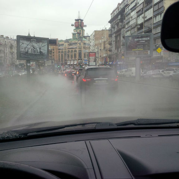 Окріп тече прямо по проїжджій частині заповнюючи вулицю паром.