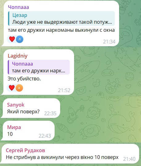 "Не стрибнув, а викинули через вікно, 10 поверх", - пише Сергій Рудаков.