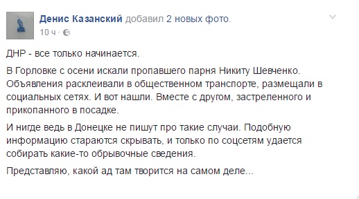 "І ось знайшли. Разом із другом, якого застрелили і прикопали у посадці. І нігде в Донецьку не пишуть про такі випадки. Подібну інформацію намагаються приховувати, і тільки по соцмережах вдається збирати якісь уривчасті відомості. Уявляю, яке пекло там насправді..." - написав блогер.