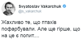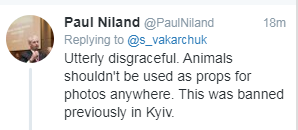 "Це вкрай ганебно. Тварини не повинні використовуватися як об'єкти для фото. Це раніше було під забороною в Києві", – написав він у коментарі в Twitter у Святослава Вакарчука.