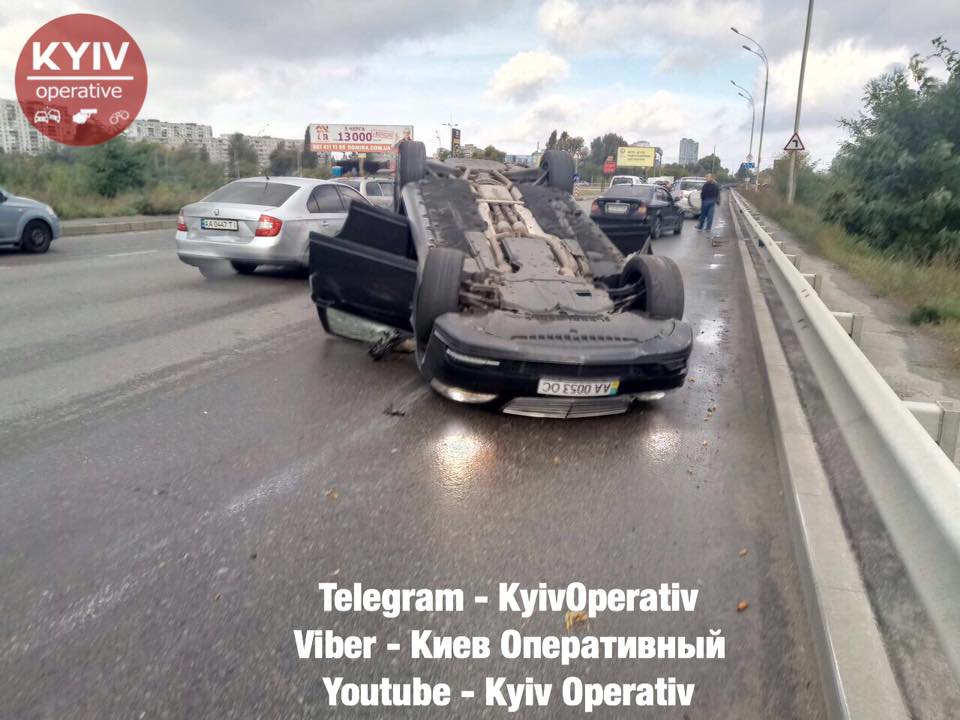 На Дарницькому мосту в Києві водій на високій швидкості не увійшов в поворот, авто перекинулось.