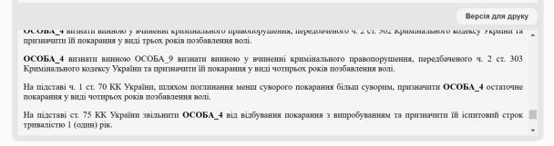 Суд затвердив угоду та визнав жінку винною за ч. 2 ст. 302, ч. 2 ст. 303 КК України. Її засудили до 1 року іспитового терміну.