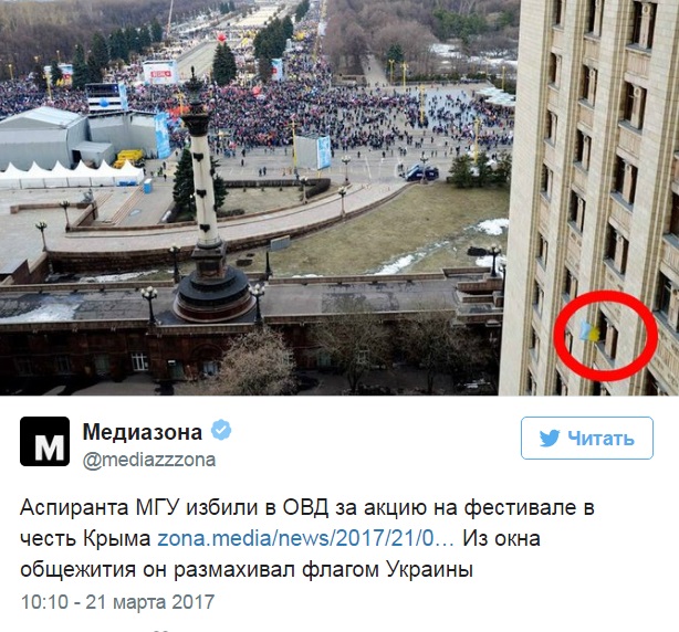 Аспіранти історичного факультету МДУ затримали і побили після того, як він вивісив із вікна гуртожитку прапор України під час концерту «Весна» на честь приєднання Криму. Про це пише «Медіазона» з посиланням на одного аспіранта, який побажав залишитися анонімним. Ім'я аспіранта також не розкривається.