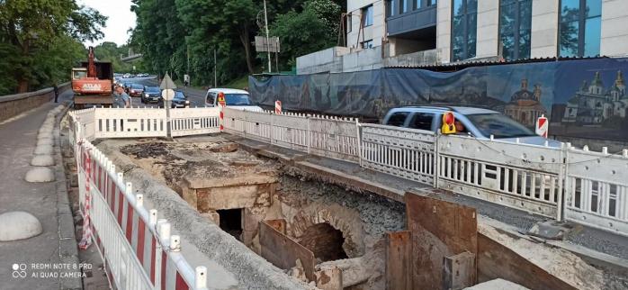 "Під час ремонтних робіт на трасі Володимирського узвозу поряд з пам'яткою архітектури - колишьої електростанції Київського трамвайного депо (Набережне шосе,4), відкрито частину старих дренажних мереж. Це склепінчастий цегляний колектор 19 ст. Тіло колектора, перерізане у сучасний період, виходило до північно-західної частини електростанції", - йдеться у повідомленні.