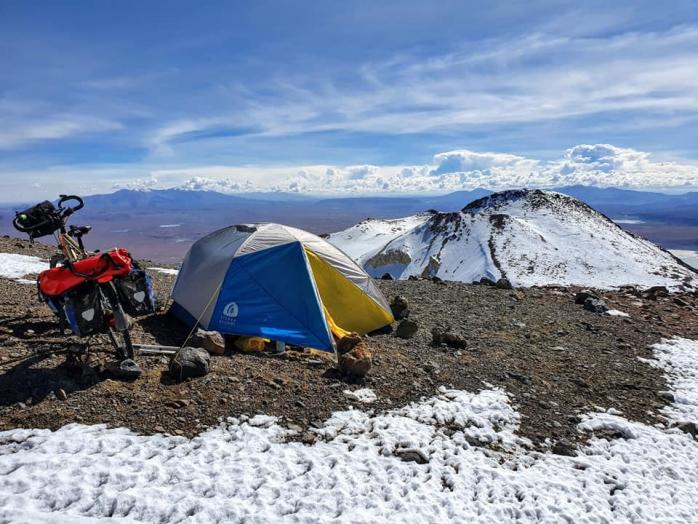 "Підбадьорився швидко – мене ж чекав зовсім невеликий підйом – і вершина 6020. Мій намет один із перших зустрічав сонце з-за обрію. Спав у старому кратері вулкана взагалі чудово, ніяк не відчуваючи висоту. Макарони варив трохи довше, але вони приготувалися. Хотів декількома частинами занести багаж і велосипед на пік. Але за звичкою склав намет, речі в сумки, а їх на велосипед і так почав штовхати його вгору", – додав українець, давши зрозуміти, що не збирається зупинятися на досягнутому і що його подорож продовжується.